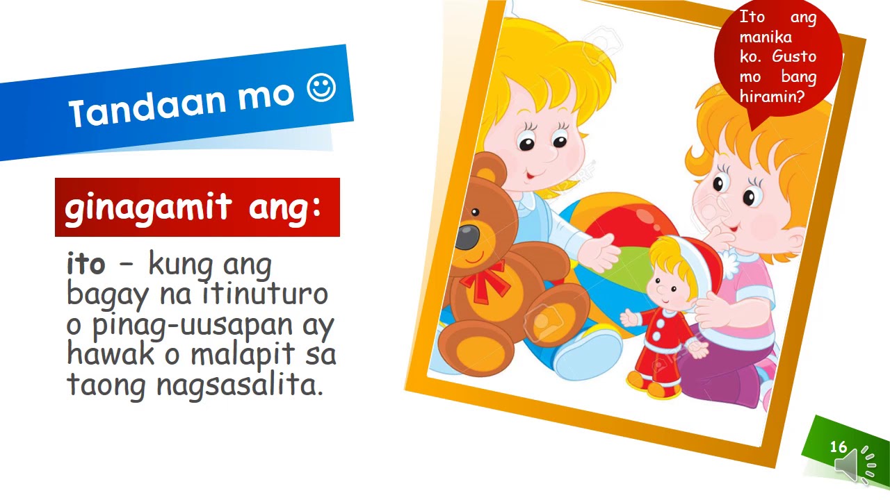 Aralin 8 Karapatan Ko 31 Pagbibigay ng Wakas sa Binasang Kuwento Paggamit ng Panghalip Pamatlig Ito Iyan Iyon Paggamit ng Ibat Ibang Bahagi ng Aklat sa Pagkalap ng Impormasyon Aralin 9 Tungkulin Ko 34 Paggamit ng. In with actor focus verbs this refers to the actor lumutang itong barko THIS boat floats. Ito this iyan that iyon that over there.