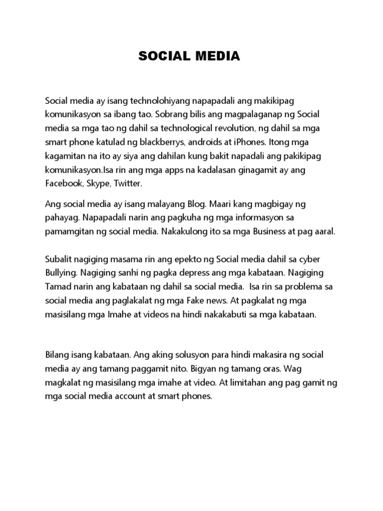 Ang kahalagahan ng social media sa bagong panahon. Kabuuan Nilalayon ng pananaliksik na ito na mahinuha ang mga detalye ukol sa kung ano nga ba ang epekto ng social media sa mga mag-aaral ng Laguna State Polytechnic University SCC PT. Tamang Paggamit ng Social Media at Makabagong Teknolohiya Sa panahon ngayon ang social media at makabagong teknolohiya ay napakahalaga mapabata man o matanda walang pinipiling edad o kasarian.