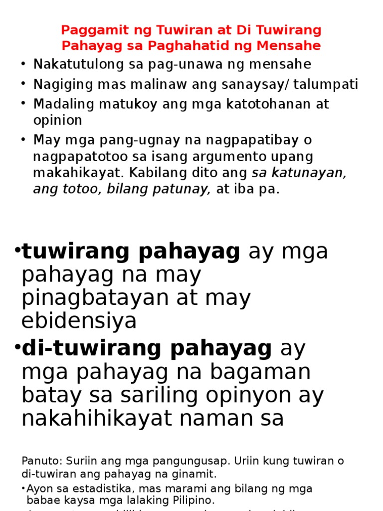 Paggamit ng tuwiran at di tuwirang pahayag sa paghahatid ng mensahe by markpablo. Kabilang dito ang sa katunayan ang totoo bilang patunay at. Paggamit ng Tuwiran at Di-Tuwirang Pahayag sa Paghahatid ng Mensahe.