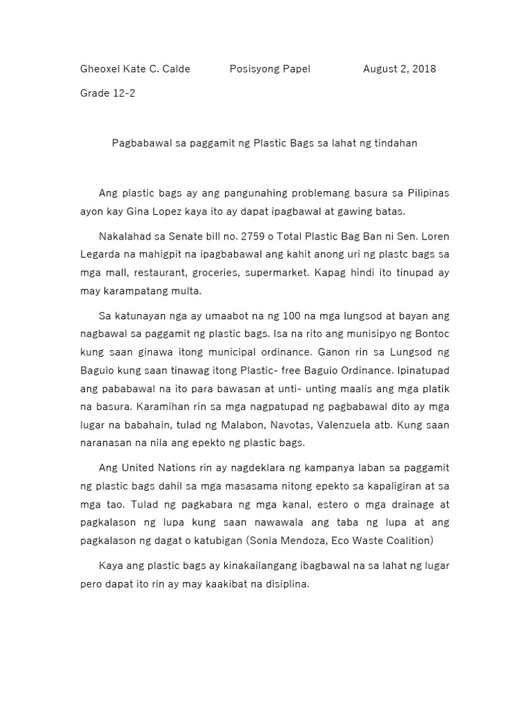 Ang pagbabawal sa paggamit ng plastik ay naging tugon na ng lokal na pamahalaan dahil sa lumalalang problema sa baha. View Filipino_posisyong papeldocx from BS EMT EM316 at Don Mariano Marcos Memorial State University. MARAMI nang bayan at lungsod ang nagbabawal sa kani-kanilang mamamayan na huwag gumamit ng plastic bags cups supot at.